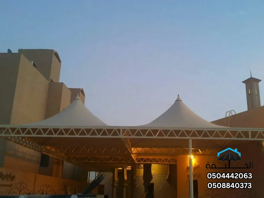 - مظلات قماشية (PVC أو PTFE): تُعد هذه المظلات خفيفة الوزن وسهلة التركيب، وتتميز بمقاومتها للعوامل الجوية مثل الشمس والأمطار.